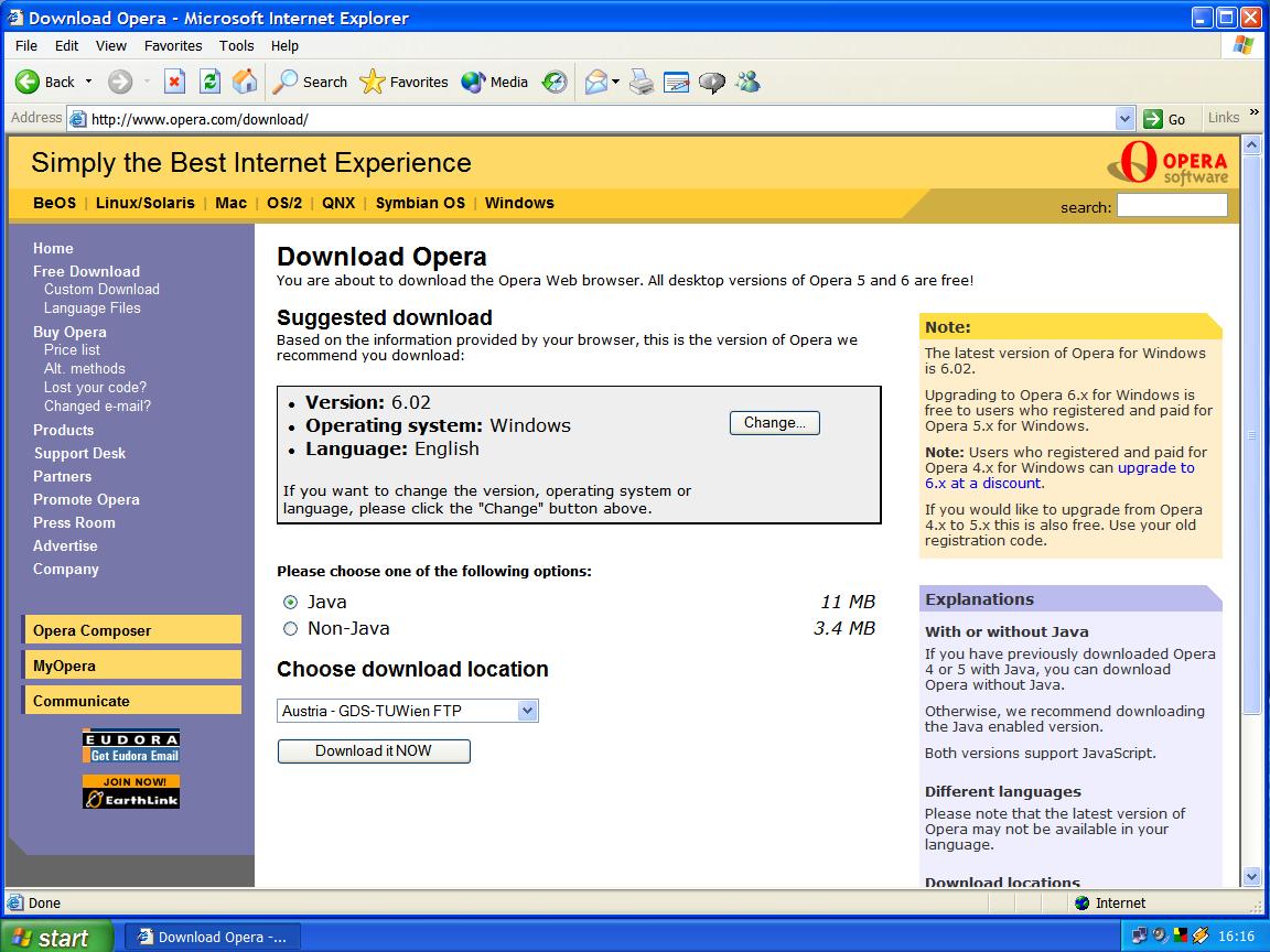 Go on line and open up either Internet Explorer or Netscape Navigator and type www.google.co.uk into the address bar. When Google has loaded type Opera into the search box and click on the search button. When the results appear, Select the top item on the list and you should be taken to the Opera web site. Whilst here you might as well have a read of what Opera has to offer. Now click on the Penguin picture and you will be taken to the Opera Download Page.