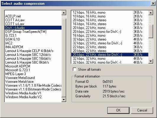 I also selected compression and used the codec for DivX audio. This brought up a submenu where it asked what quality I wanted. I chose 20kbps.