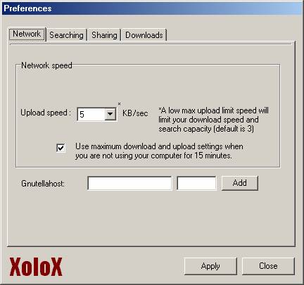First up, the network. I just left these on the default setting. Xolox uses the Gnutella system, and the list of servers automatically updates when you go online. You can add your own here if you so desire.