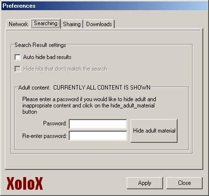 Another good point about Xolox is that you can ensure that the kids don’t get bothered by adult content and here is where you password it to prevent access to it. Since it uses the Gnutella servers, there is quite a lot of adult content , so this is a very good option if your kids do get their hands on your computer. I’m lucky in our house, in that the kids’ computer isn’t networked to mine and the only P2P on theirs is Audio Galaxy.