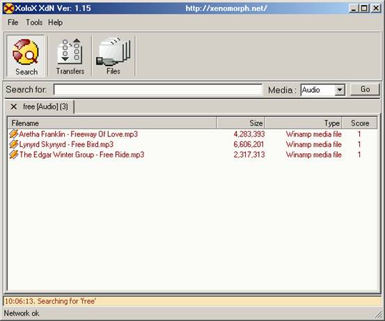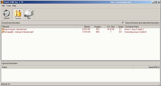 The transfer window looks like this , and shows the download status of your choice of file, and any uploads happening. The download status shows how many people currently online have the file you want and how many you are actually downloading from e.g. on the Lynyrd Skynyrd download, I was actually downloading from one person, and 3 other people had the file but their connections were busy.