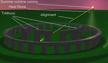 Stonehenge at about 1500 BC consisted of a circular ditch, with a raised bank on the inside. Within the bank was a circle of 30 Sarsen stones with lintels creating a raised circle. Today only 17 of those stones still stand and few of the lintels are still in position. Within the ring were five "trilithons" (two massive upright stones supporting a lintel) arranged in a horseshoe. On the open side of the horseshoe, outside the ditch, was the heel stone, some 120 feet from the ring. Once a year, on summer solstice (the longest day of the year), the sun will rise in alignment with the heel stone as seen from the center of the ring.