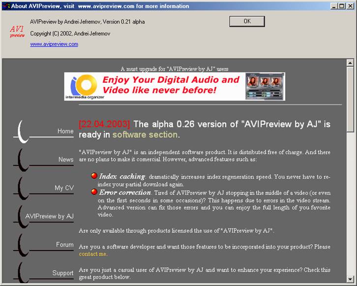 While I was having a quick browse through the author’s site, I saw that he mentioned that there was another program called AviPreview. It also gave the address for it, so off I went. The address is http://www.funkster.org as you will see in the following grabs.