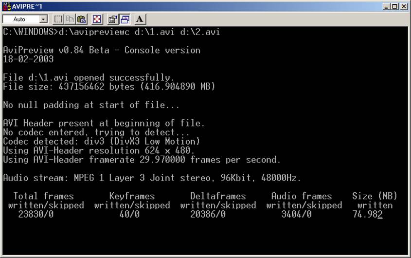 I simply used the AviPreviewC inputfilename outputfilename command line.