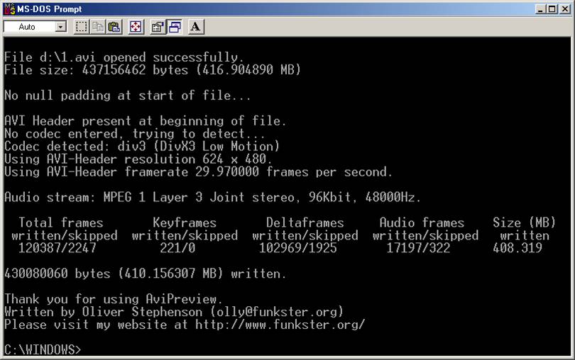 The latest version of the program can be downloaded at http://www.avipreview.com as can be seen above. Basically the download is a couple of hundred Kb, so won’t cost any time at all to download. It comes in a simple zip archive which you extract anyplace you please. Starting the program, you get the GUI shown above. Select file, tell it where the fragment is, and you get something like this…