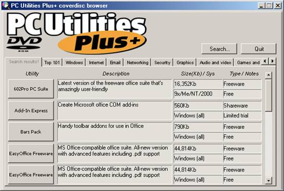 Back to the DVD, the browser gives basic information on all the programs. It gives the size of the program and a quick install button. This is a boon as well and there is even a search on the browser to help you even more. I did a search for Office to try it out…