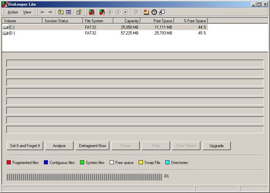 This is the usual face of DisKeeper. Most of the buttons will pop up a small “this is in the full version “ when you try them.