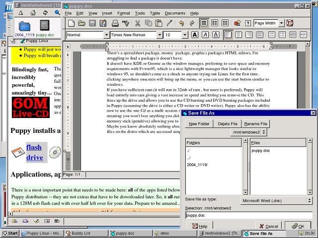If you have sufficient ram (it will run in 32mb of ram , but more is preferred), Puppy will load entirely into ram giving a vast increase in speed and letting you remove the CD. This frees up the drive and allows you to use the CD burning and DVD burning packages included in Puppy (assuming the drive is either a CD writer or DVD writer). Puppy also has the ability now to use the one CD as a multi session so all your data can be saved back to the drive meaning you won't lose anything you did using the distro. Since Puppy is so small it is ideal to put on a memory stick (pendrive) allowing you to boot from that or a zip disk.