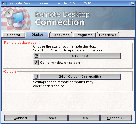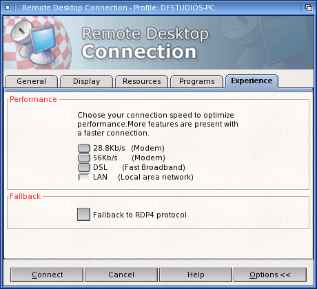Clicking on the Options button will provide you with more options to configure RDesktop. All of the options are explained in the RDesktop documentation so only the main ones will be discussed here.