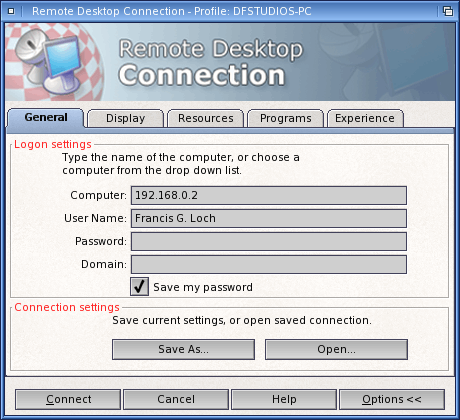 The Logon settings section allows you to enter the address of the computer the same as before and also additional details such as the user name, password and the domain so that RDesktop can automatically log in without you having to input these details at the Windows logon screen. You can also choose to save the password so that you do not have to type it in every time you logon.
