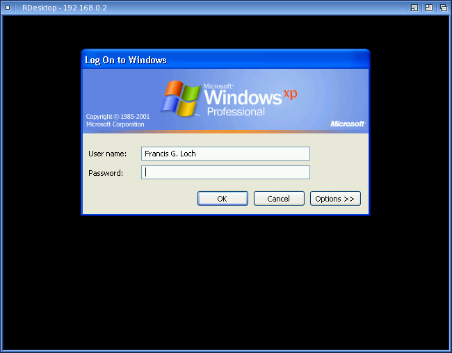 Assuming everything has gone smoothly so far, clicking on Connect should present you with the Windows login window. Here you would type in your user name and password if RDesktop has not already been configured to automatically log you in.