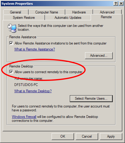 Under the Remote Desktop section make sure that Allow users to connect remotely to this computer has been ticked (highlighted in the above image).