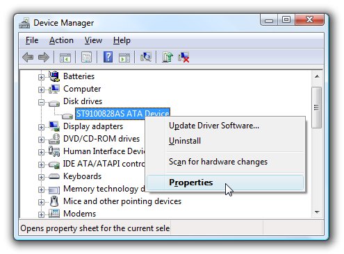 Open the Disk drives section of the tree, and right-click on your hard drive, choosing Properties.